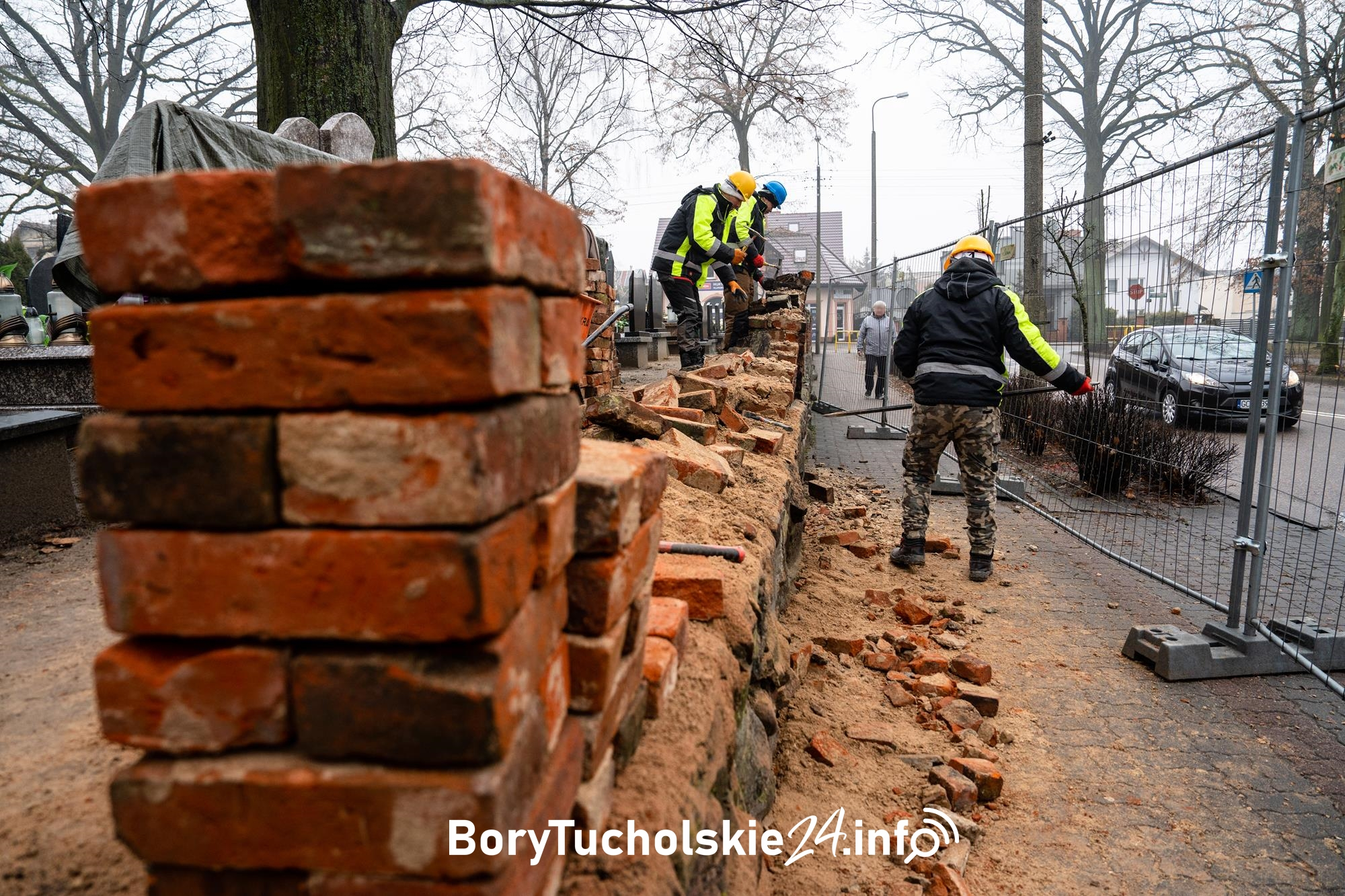 Trwa rozbiórka zabytkowego muru cmentarza w Czersku