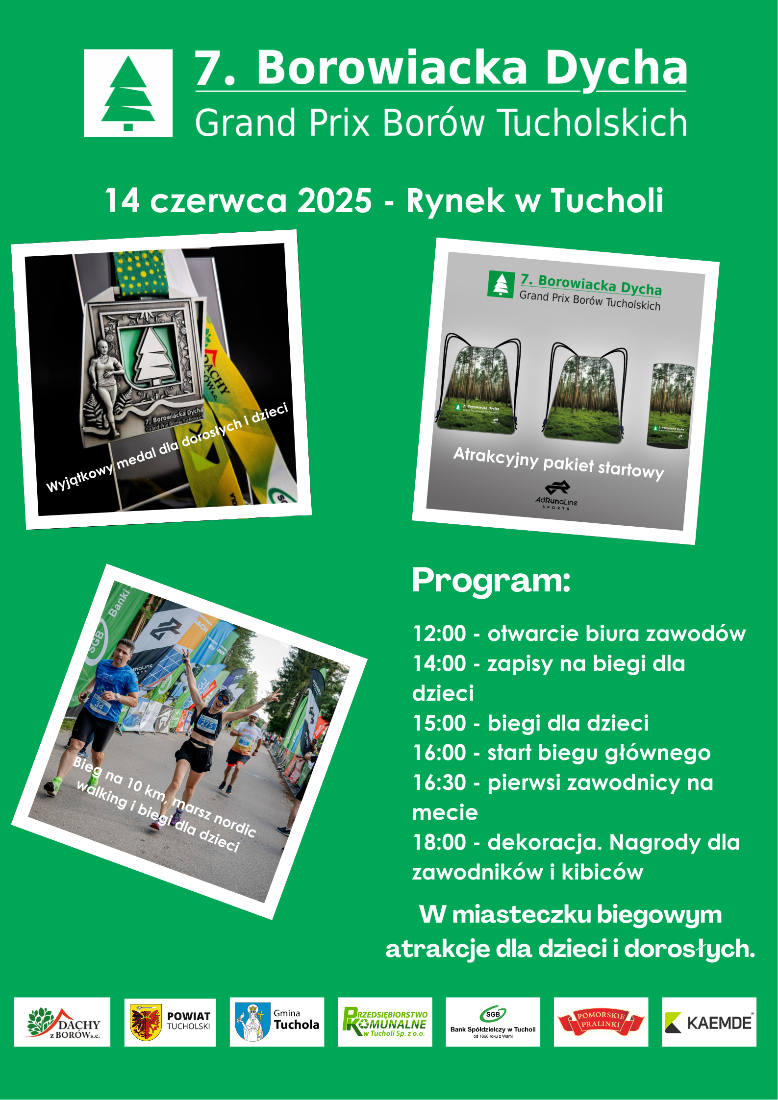 Już w sobotę , 14 czerwca, wystartuje 7. Borowiacka Dycha w Tucholi. To bieg na 10 km, marsz nordic walking na 5 km i biegi dla dzieci. Bieg jest trzecim w cyklu Grand Prix Borów Tucholskich. Wcześniej zawodnicy rywalizowali w zawodach w Okoninach Nadjeziornych i w Osiecznej. W obu tych lokalizacjach na starcie stawały rekordowe liczby uczestników. Rywalizację podczas Wilczej Dychy zdominowali zawodnicy z Kenii. Zajęli po dwa pierwsze miejsce w klasyfikacji kobiet i mężczyzn. W Tucholi na starcie zobaczymy piątkę reprezentantów Afryki, mocnego Polaka Mateusza Niemczyka czy zwyciężczynię zeszłorocznego Grand Prix Borów Tucholskich Sviatlanę Sanko.