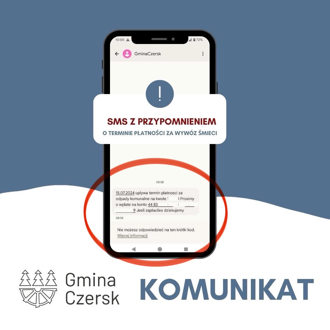 Urząd Miejski w Czersku zachęca mieszkańców do zapisania się na bezpłatne powiadomienia SMS, które przypominają o zbliżającym się terminie płatności za wywóz śmieci. Przypomnienia wysyłane są kilka dni przed 15. dniem każdego miesiąca – terminem, do którego należy uiścić opłatę za miesiąc poprzedni.