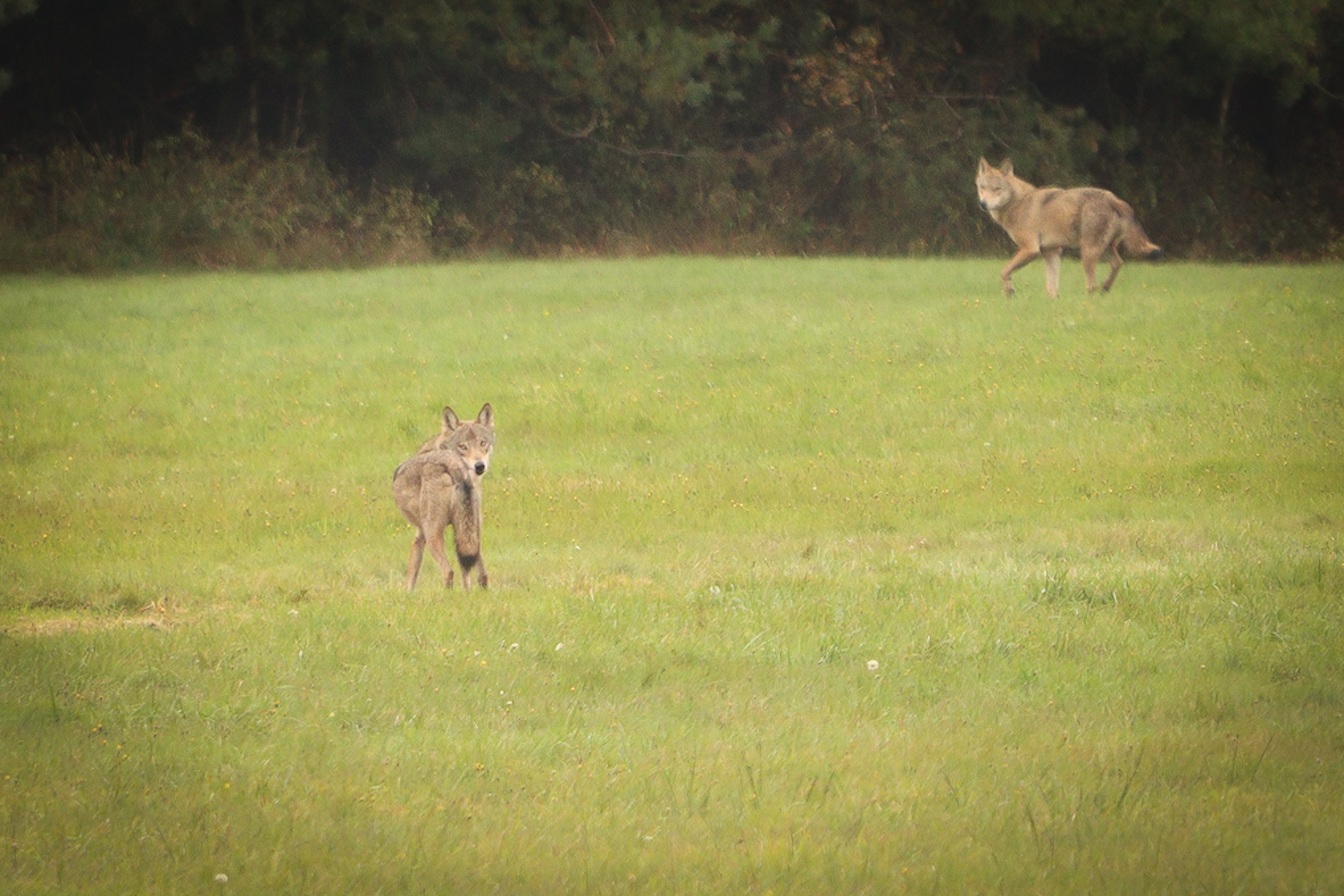 Dominik Trzaskowski uchwycił dwa wilki spacerujące po leśnej łące. Osobniki wyszły z lasu w okolicy Klaskawy w gminie Czersk.