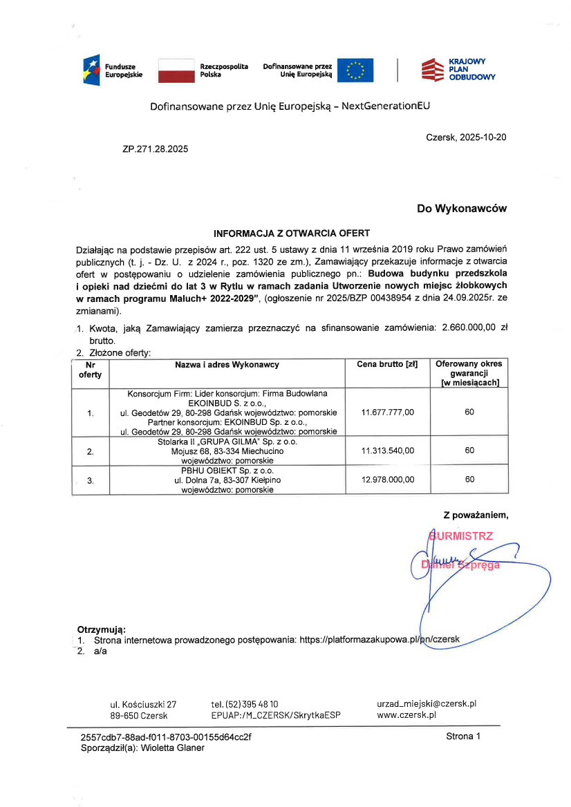 W poniedziałek w czerskim urzędzie otworzyli oferty przetargowe na budowę żłobka i przedszkola w Rytlu. Wcześniej na zebraniu wiejskim burmistrz Szpręga mówił, że obiekt może kosztować osiem milionów złotych. Najniższa kwota w przetargu to 11 313 540 zł. Czyli o ponad 3 mln zł więcej.