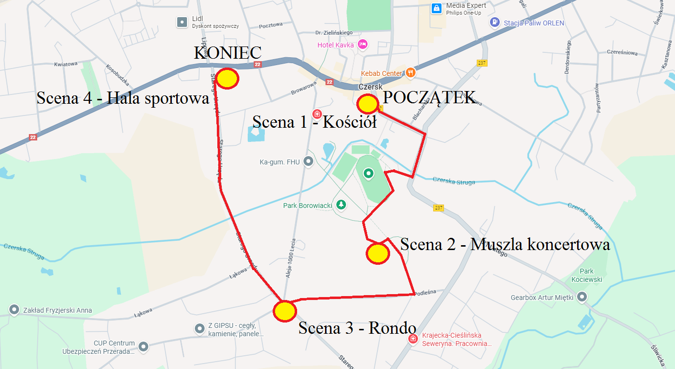 Orszak Trzech Króli wyruszy sprzed kościoła pw. św. Marii Magdaleny w Czersku. Narratorem będzie ks. Piotr Wietrzykowski, który poprowadzi wszystkich przez kolejne etapy przemarszu. Uczestnicy ustawią się na ul. Szkolnej, skąd o godz. 13.20 nastąpi oficjalny wymarsz. Na schodach prowadzących do kościoła zaplanowano pierwszą inscenizację, przygotowaną przez Katolicką Wspólnotę Odnowy w Duchu Świętym "Wieczernik" działającą przy parafii. Następnie orszak przejdzie w kierunku stadionu miejskiego. Po wejściu na teren obiektu uczestnicy skierują się lewą stroną stadionu do muszli koncertowej, gdzie odegrana zostanie druga scena, przygotowana przez przedstawicieli Uniwersytetu Trzeciego Wieku.