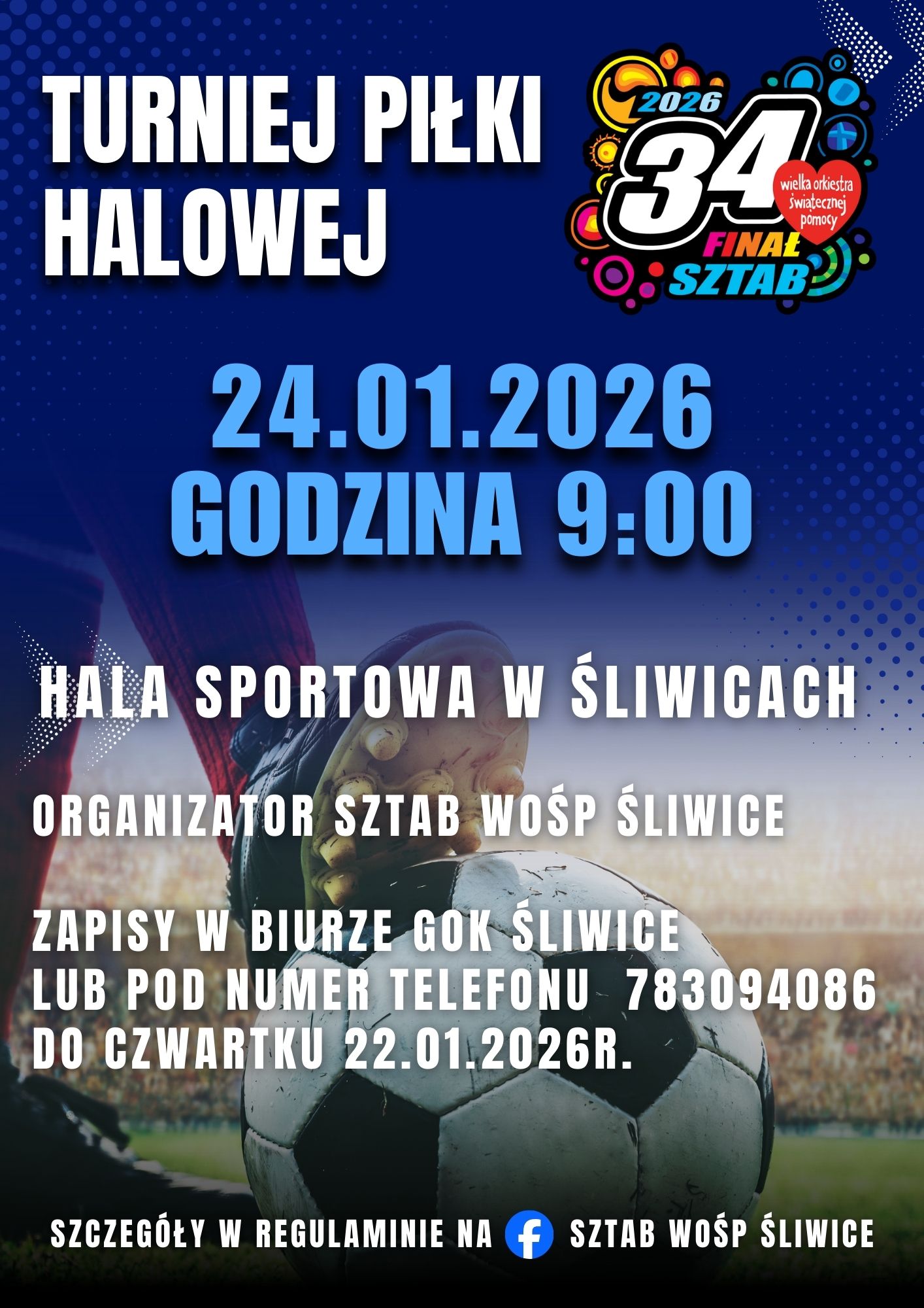 Turniej piłki halowej odbędzie się w sobotę, 24 stycznia, czyli dzień przed właściwym finałem Wielkiej Orkiestry Świątecznej Pomocy. Organizatorem wydarzenia jest Sztab WOŚP w Śliwicach, który zaprasza do udziału zarówno młodzież, jak i osoby dorosłe.