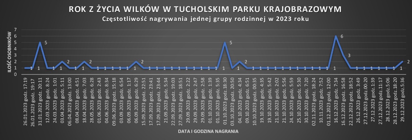 W 2025 roku monitoring prowadzono już przy użyciu 11 fotopułapek. Dane z całego roku potwierdziły obecność czterech grup wilczych - A, B, C oraz nowo zidentyfikowanej grupy D. Największą aktywność odnotowano w obrębie grupy A, gdzie regularnie rejestrowano zarówno pojedyncze osobniki, jak i kilka wilków jednocześnie. - Dane z 2025 roku, obejmujące liczne rejestracje z fotopułapek, uzupełnione o obserwacje terenowe, potwierdzają stabilność głównych struktur populacyjnych oraz skuteczność prowadzonego monitoringu, przy jednoczesnej konieczności dalszej obserwacji nowo zidentyfikowanych grup. - informuje specjalista z TPK.