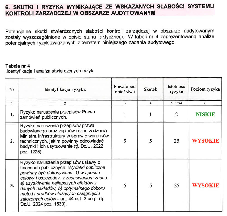 Na koniec audytu Tomasz Zaremba ocenił ryzyka wynikające ze „słabości systemu kontroli zarządczej”. Naruszenie przepisów zamówień publicznych ocenił jako niskie. Jednak to związane z prawem budowlanym oraz ustawą o finansach publicznych, jako wysokie. Tabele przygotowane przez audytora znajdziecie poniżej.