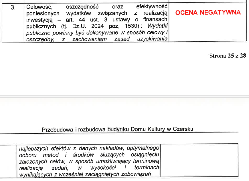 Audytor zarzuca też gminie Czersk naruszenie zasady oszczędnego oraz efektywnego gospodarowania środkami publicznymi. Pisze o kilku fakturach z różnych firm. Najpierw był projekt, a później kilka jego aktualizacji. Mimo że faktury wystawiały inne firmy, jako ich reprezentanci widnieją ci sami wykonawcy. W sumie kosztowało to niespełna 120 tys. zł, a ostatnia płatność miała miejsce dwa miesiące po otwarciu obiektu.