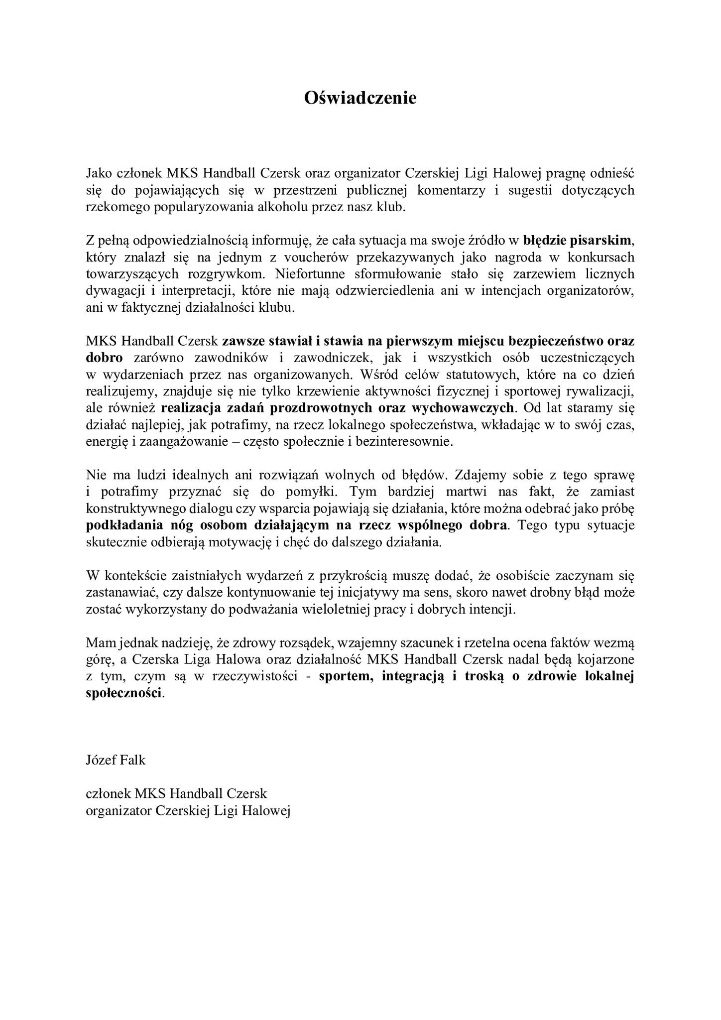 PISMO BURMISTRZA I OŚWIADCZENIE MKS SPR POLSKA HANDBALL CZERSK SĄ POD TEKSTEM.