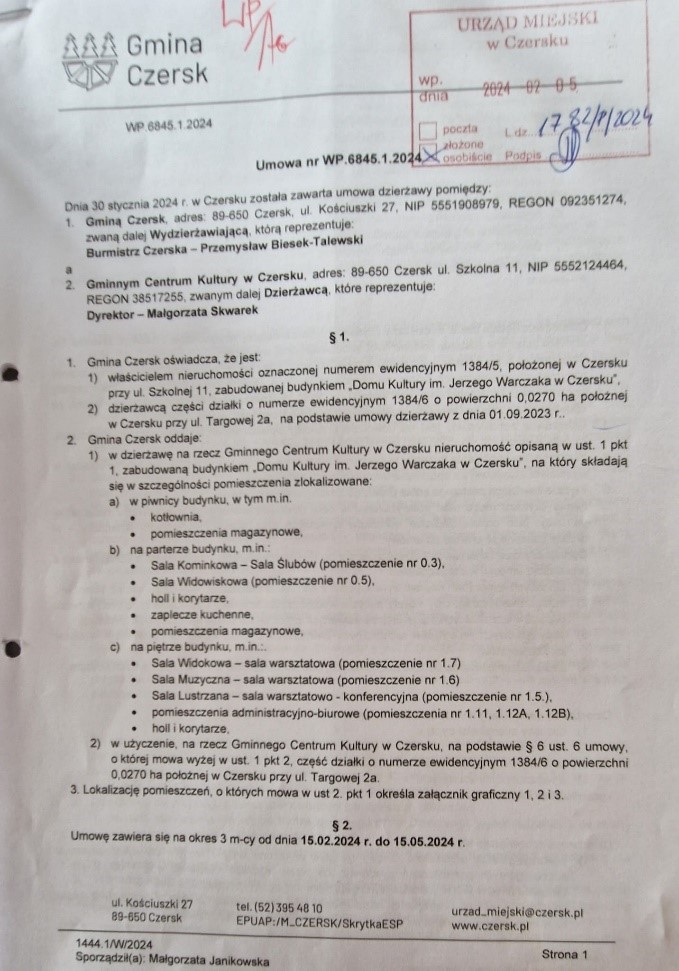 „Weszliśmy w posiadanie informacji, że biuro dyrektora Gminnego Centrum Kultury w Czersku zostało przeniesione z części administracyjnej obiektu i obecnie funkcjonuje w Sali Widokowej, która zgodnie z projektem oraz zgodnie z umową dzierżawy zawartą pomiędzy Gminą Czersk a GCK miała być salą warsztatową, w której organizowane będą różne zajęcia dla mieszkańców naszej gminy” – czytamy w piśmie.