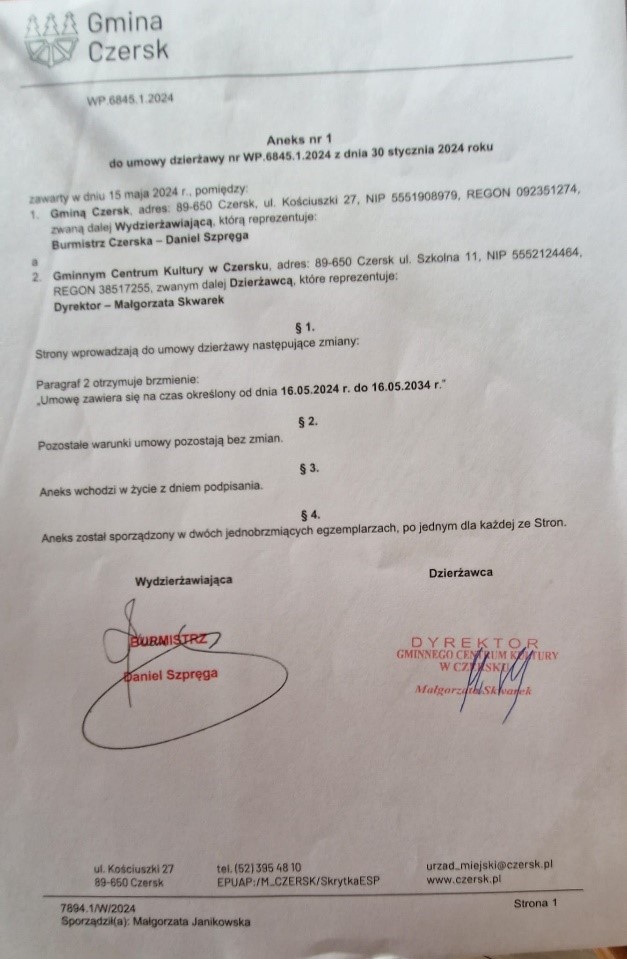 Już podczas kontroli Przemysław Biesek-Talewski mówił, że zgodnie z umową dzierżawy zawartą pomiędzy gminą Czersk i Gminnym Centrum Kultury, zmiana przeznaczenia pomieszczeń wymaga odrębnego aneksu. W GCK aneksu, ani nawet umowy nie było. Radni udali się więc do urzędu miejskiego. „Według oświadczenia pani Małgorzaty Janikowskiej – kierowniczki Wydziału Planowania i Gospodarki, nie ma pisemnej zgody Gminy na zmianę przeznaczenia Sali Widokowej z sali warsztatowej na pomieszczenie administracyjne (gabinet dyrektora)” – zauważają radni.