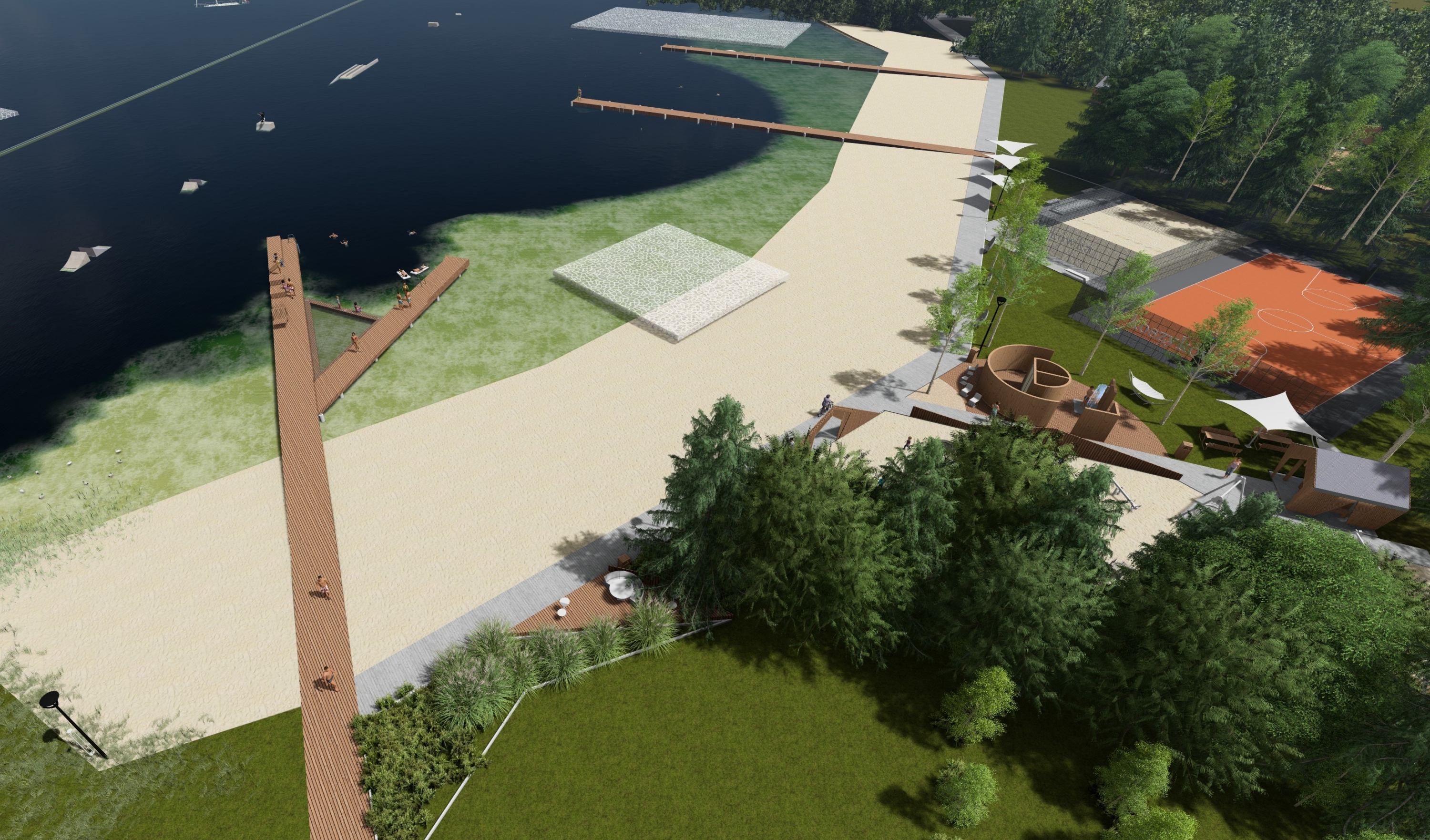 Co jest w planach? Slip wodny i nowy pomost, modernizacja istniejących pomostów, parki dmuchane, zjeżdżalnia wodna i trampolina, huśtawka dla osób z niepełnosprawnościami, kręgielnia plenerowa i nowy element wspinaczkowy czy ekologiczne oświetlenie solarne. Mają też powstać nowe boiska do siatkówki plażowej i koszykówki ulicznej. Zaplanowano mnóstwo elementów architektury. Na wspomnianym nowym pomoście mają znaleźć się ławeczki oraz siatka rozpięta na taflą jeziora, nad której będzie można sobie poleżeć. Na plaży ma tez pojawić się dmuchany zamek dla dzieci, który będzie darmowy.
