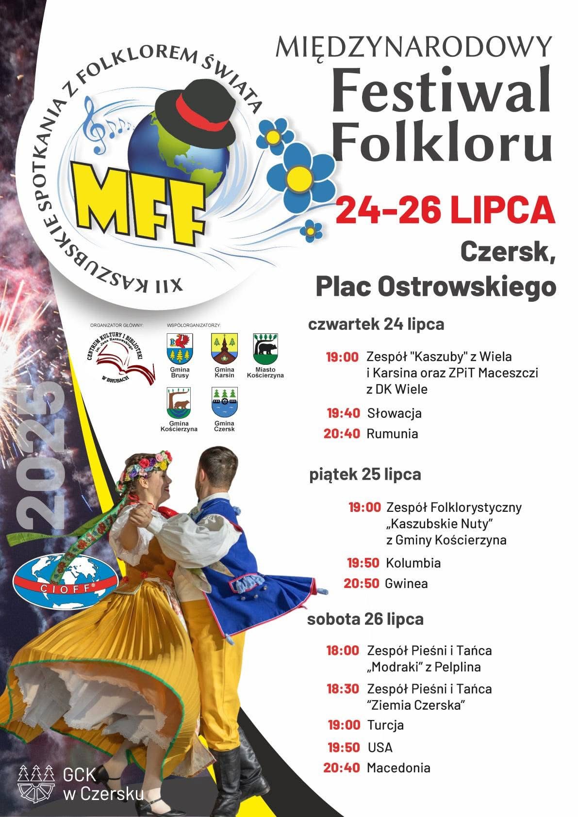 Międzynarodowy Festiwal Folkloru w Czersku odbędzie się w dniach 24–26 lipca na Placu Ostrowskiego. W wydarzeniu wezmą udział zespoły folklorystyczne z Macedonii, Gwinei, Turcji, Kolumbii, Słowacji, Rumunii i Stanów Zjednoczonych. W programie znajdą się prezentacje tańca, muzyki i tradycji ludowych reprezentowanych krajów.