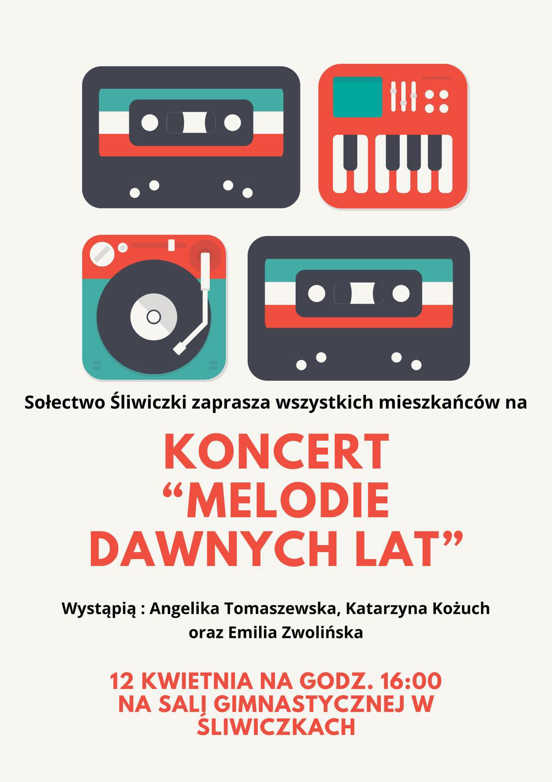 Sołectwo Śliwiczki zaprasza mieszkańców na koncert „Melodie dawnych lat”, który odbędzie się 12 kwietnia o godzinie 16:00 na sali gimnastycznej w Śliwiczkach. Na scenie wystąpią Angelika Tomaszewska, Katarzyna Kożuch oraz Emilia Zwolińska. Wydarzenie ma charakter otwarty.