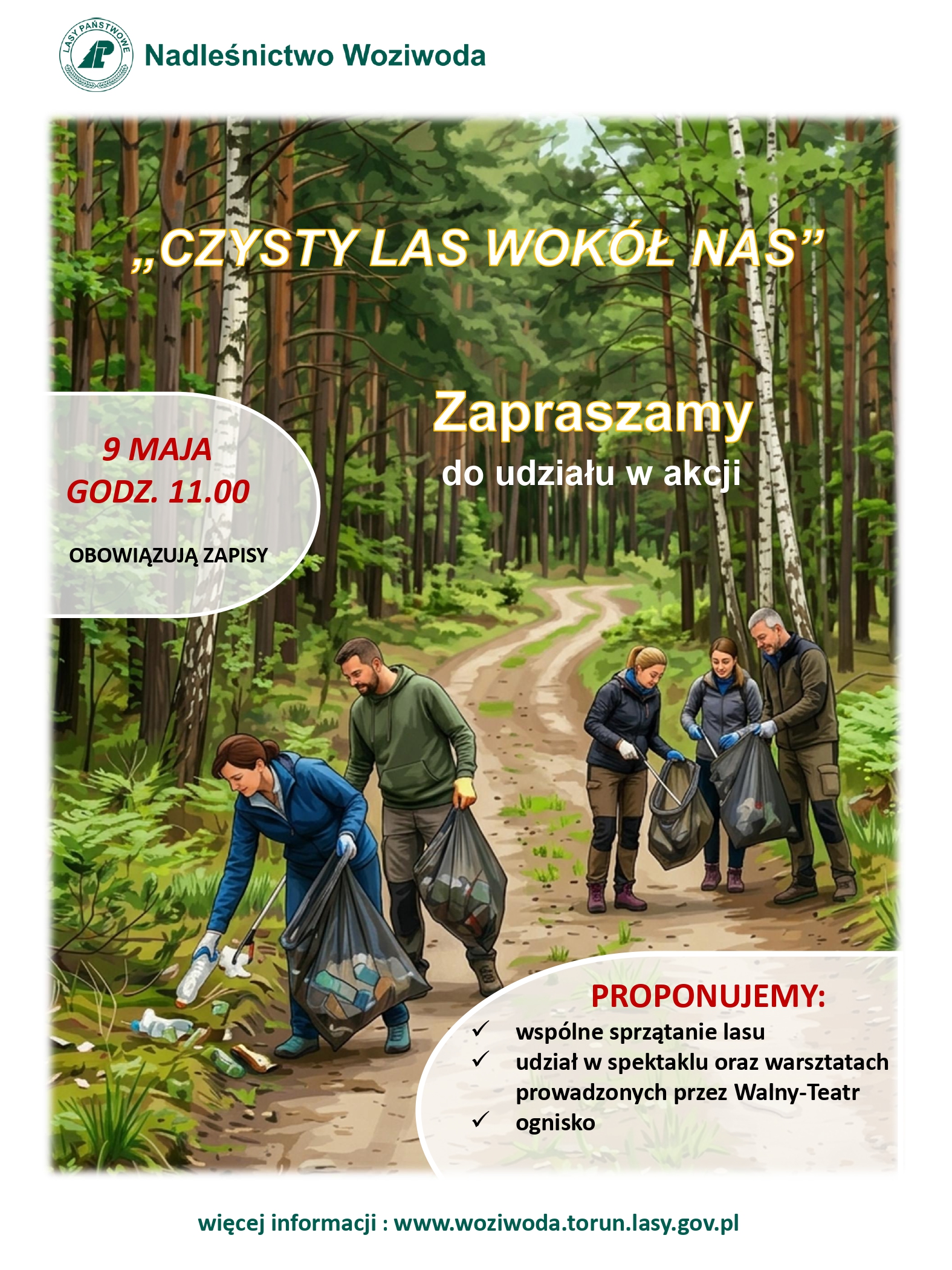 Nadleśnictwo Woziwoda zaprasza do udziału w akcji „Czysty las wokół nas”, która połączy wspólne sprzątanie terenów leśnych z dodatkowymi zajęciami dla uczestników, takimi jak spektakl oraz warsztaty dla dzieci i dorosłych. To propozycja dla osób, które chcą aktywnie spędzić czas i jednocześnie zrobić coś dobrego dla środowiska.